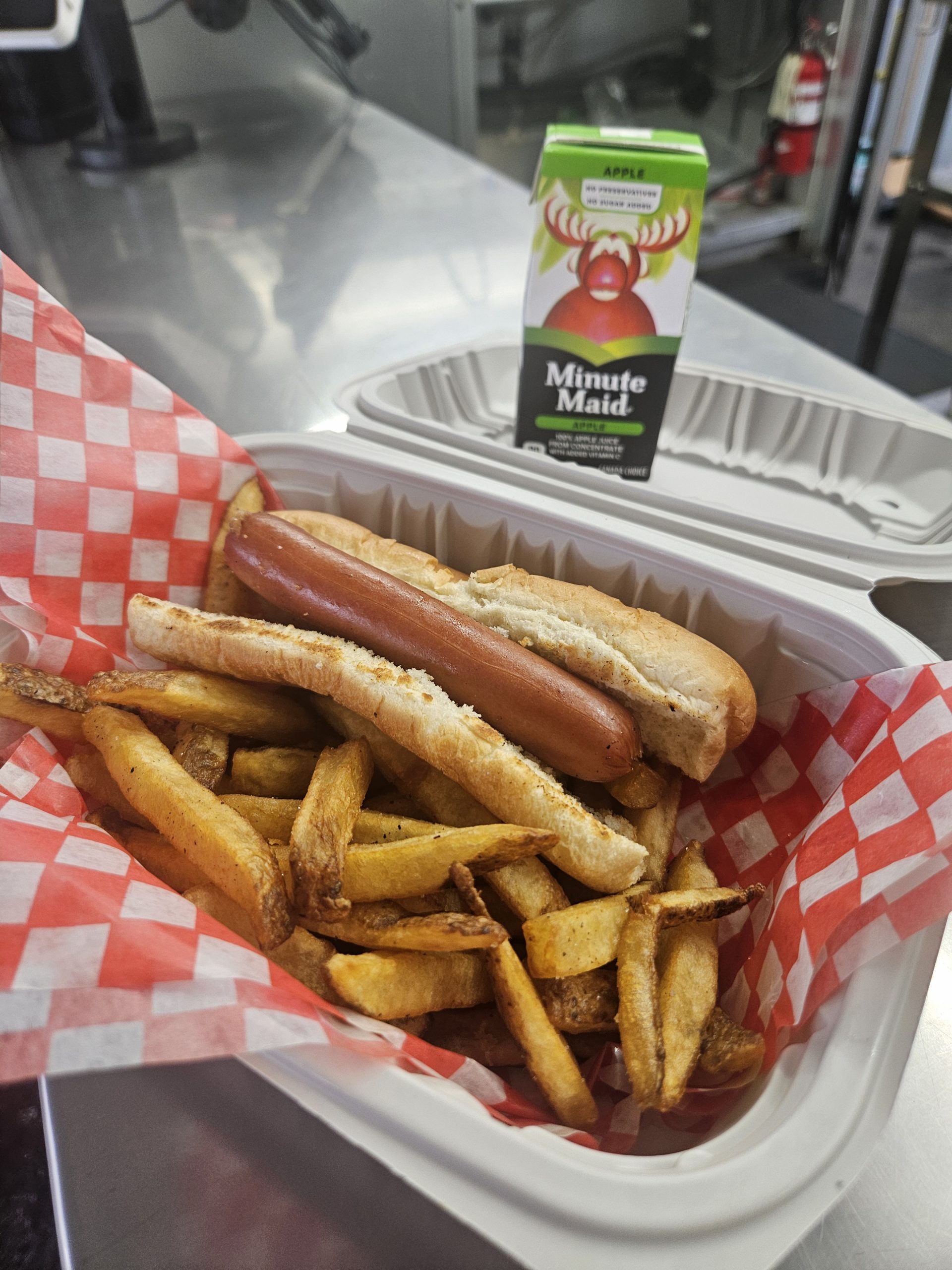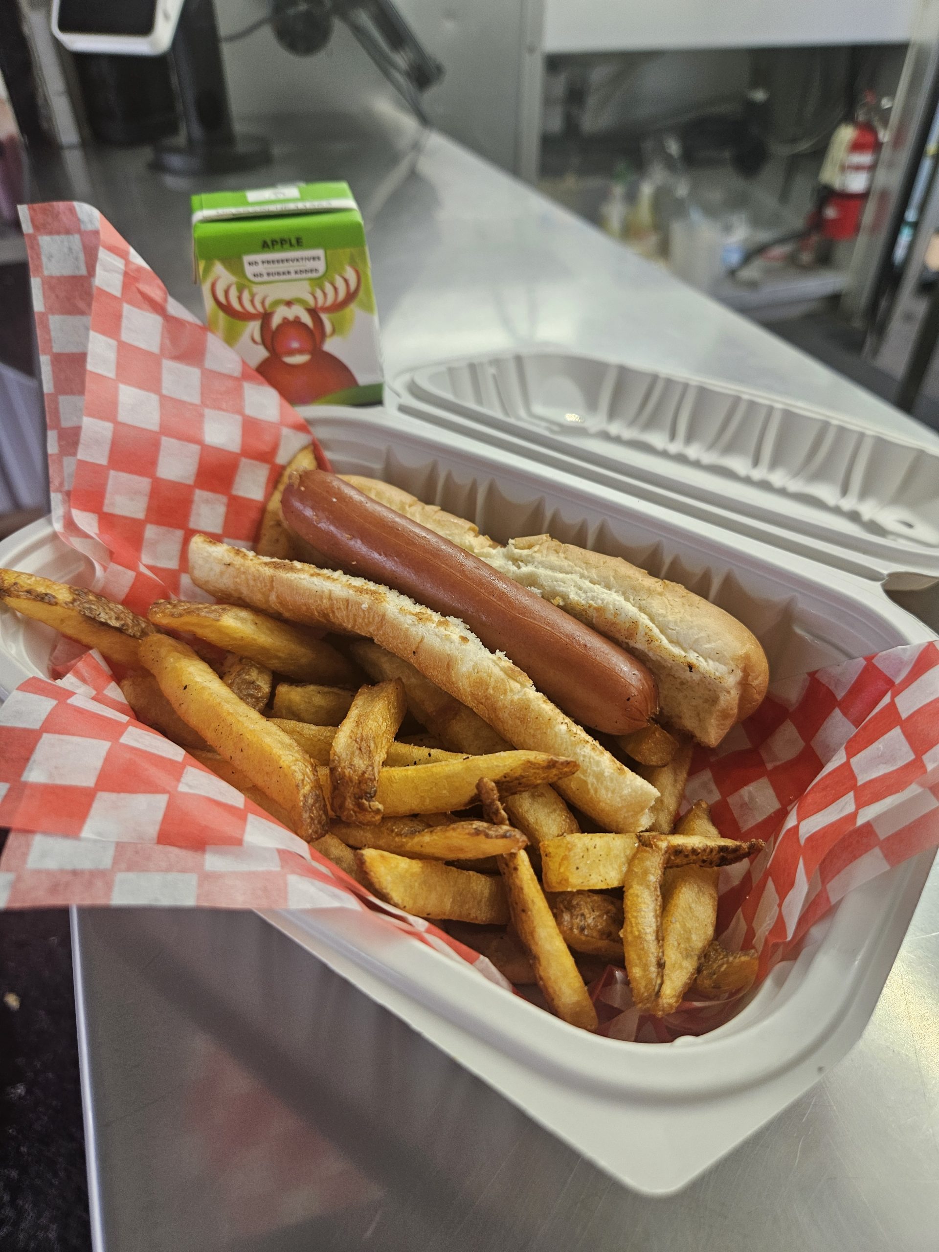 A yummy hot dog on a soft bun, served with mini golden fries and a juice to sip. Just the right size for little tummies and big smiles!